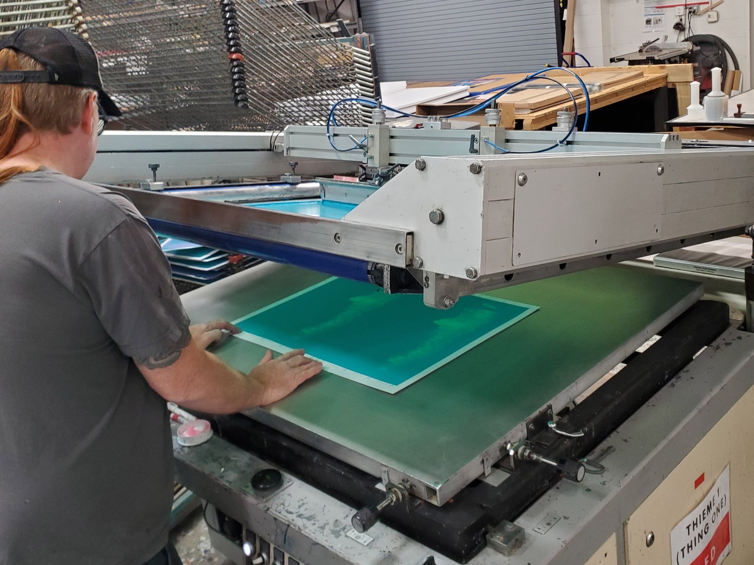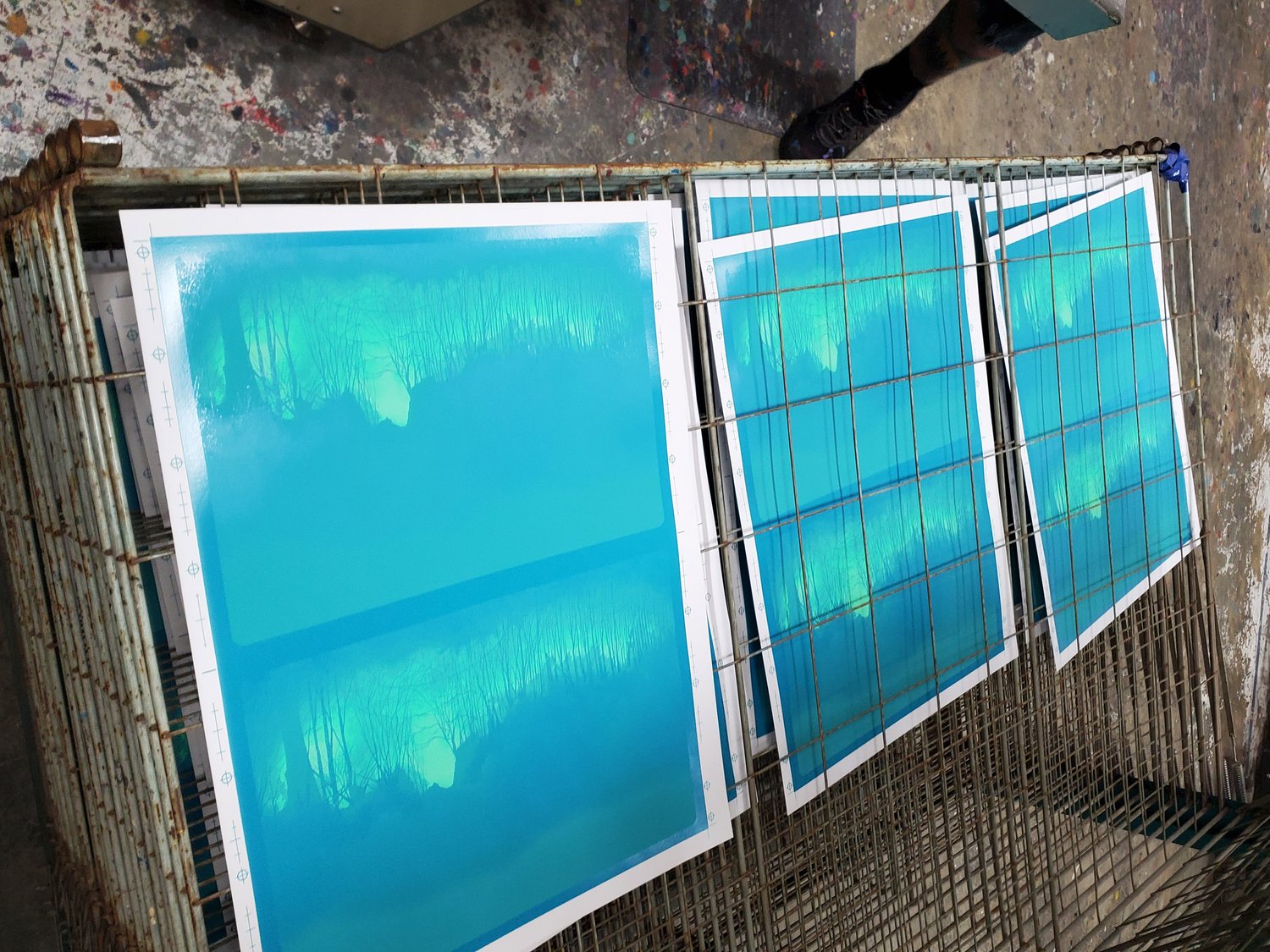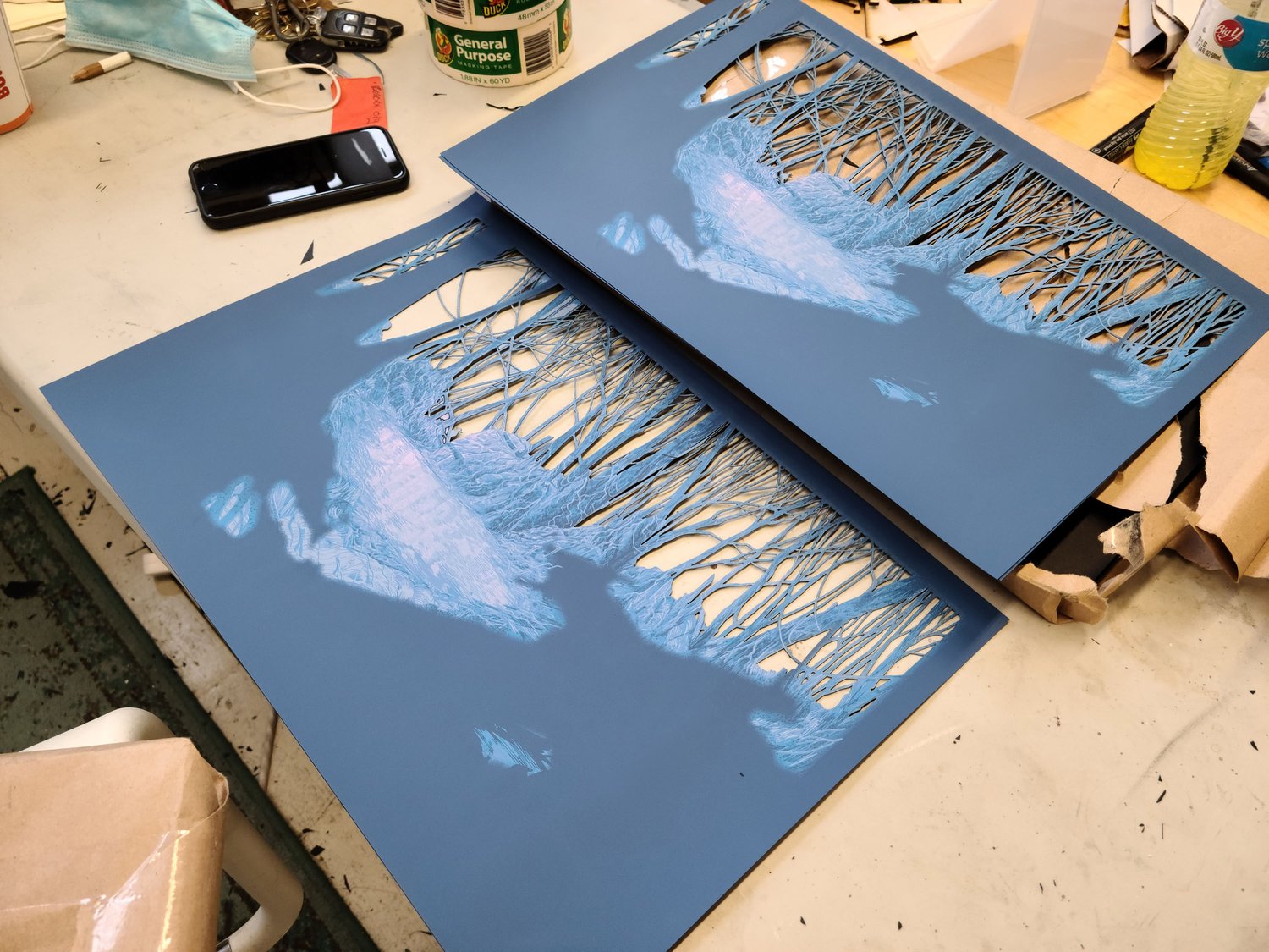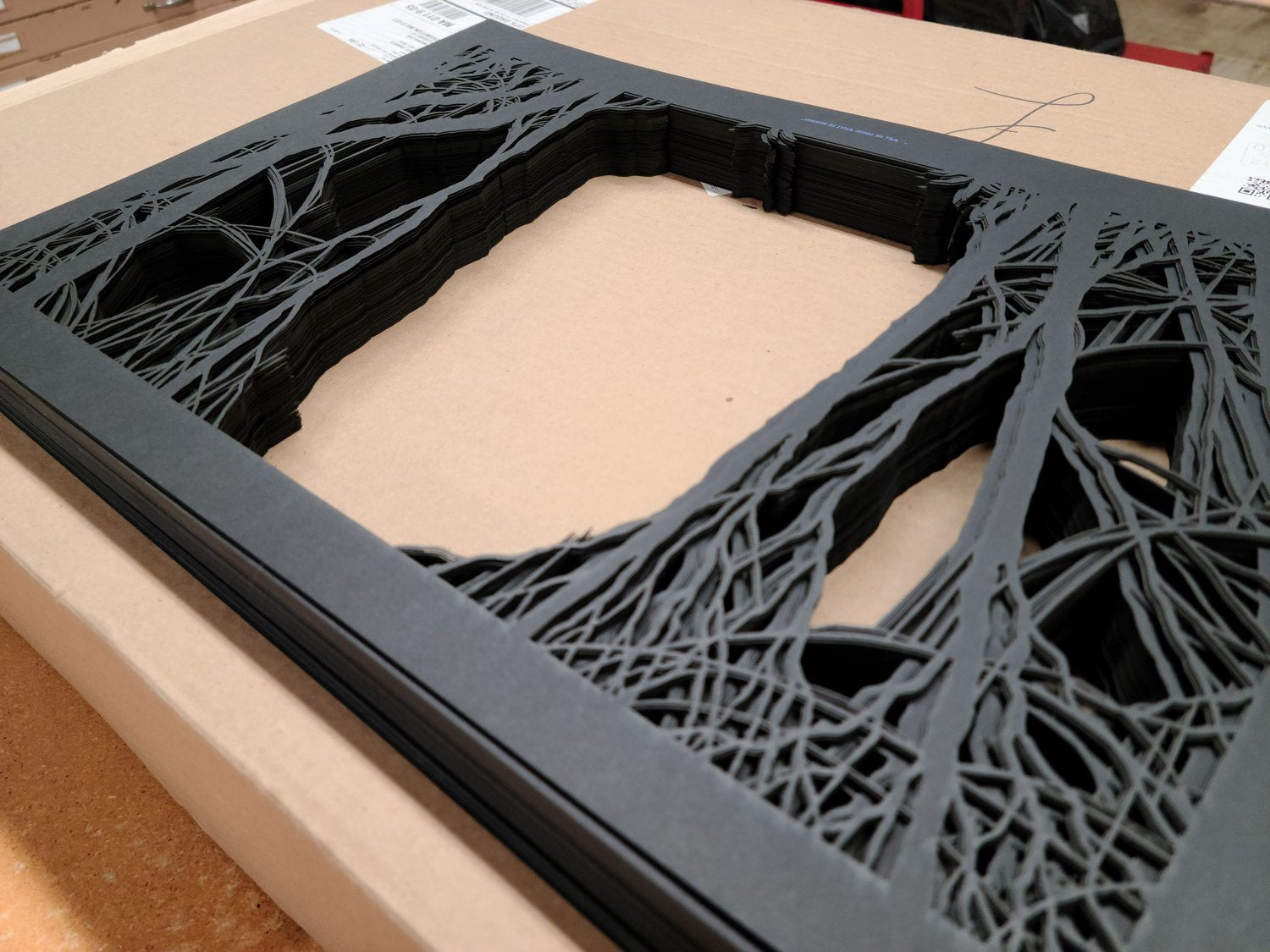 18 color screen print across background with three laser-cut layers
